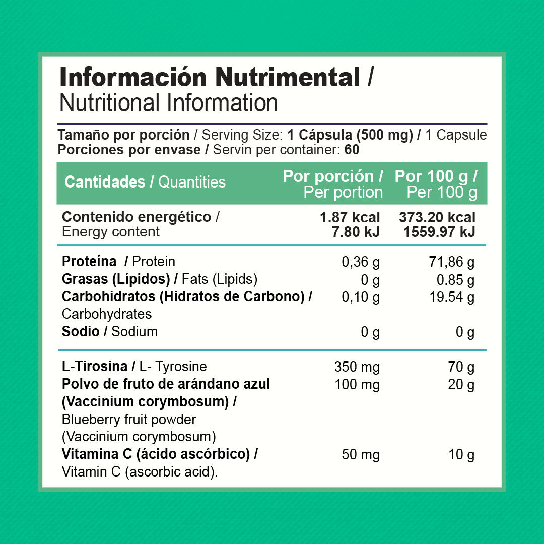 Nuestro suplemento L-Tirosina 500mg combina nutrientes clave para el desempeño mental: