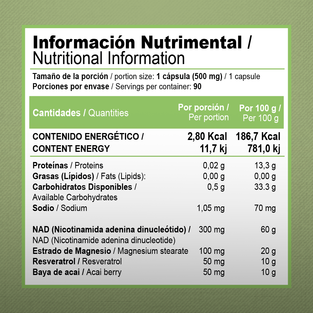 Esta fórmula combina NAD+ (Nicotinamida Adenina Dinucleótido) con Resveratrol de alta pureza, ingredientes utilizados como parte de estilos de vida que buscan apoyar el bienestar y el equilibrio celular.